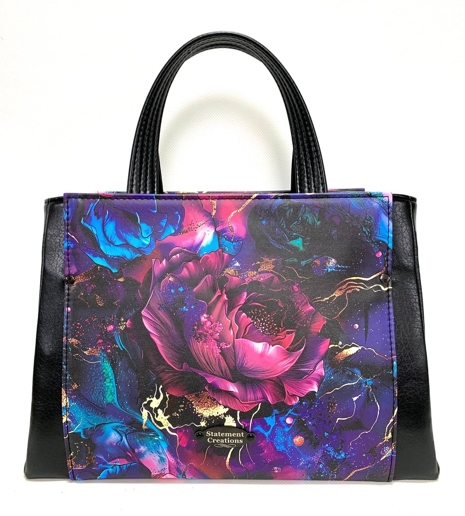 - Magnetic snap closures on the side panels, allowing the bag to expand or maintain a sleek shape